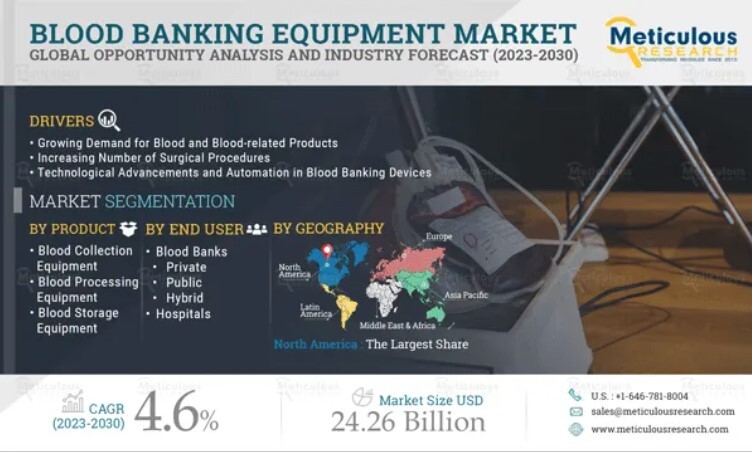 Очікується, що до 2030 року ринок обладнання для банків крові досягне 24,26 мільярда доларів із середньорічним зростанням 4,6% з 2023 по 2030 рік. Традиційно банк крові накопичує, відокремлює, тестує та зберігає кров і продукти крові до потреб пацієнтів. Обладнання банків крові використовується в цих банках крові для збереження та зберігання крові людини та її продуктів. Цей звіт про ринок обладнання для банків крові охоплює обладнання для збору крові, обладнання для обробки крові та обладнання для зберігання крові, які пропонують гравці ринку для використання в банках крові та лікарнях. Обладнання для зберігання крові може бути ручним або автоматизованим.