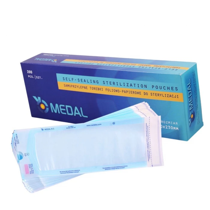 Самоклеючі паперово-плівкові пакети для стерилізації MEDAL виготовлені з медичного паперу щільністю 60 г/м² та багатошарової плівки. Використовуються для медичної стерилізації парою (STEAM). Широкий розмірний ряд дає можливість підібрати виріб під конкретні вимоги та призначення.
