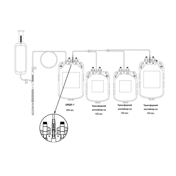 Контейнери одноразового застосування для заготівлі крові та для зберігання клітин крові з з’єднувальними трубками, що мають ідентифікаційні номери; стерильною голкою одноразового застосування; магістраллю з затискачами для взяття зразків крові обладнану пристроєм портом для використання вакуумних пробірок та преддонаційним контейнером, з захистом уколу голкою (ЗУГ), та розчином ЦФДА-1 в модифікації 450/150/150/150